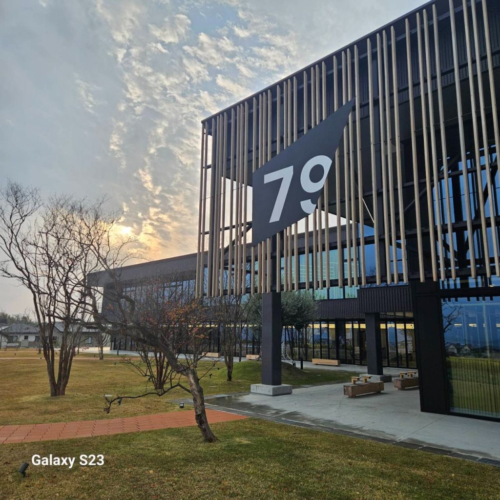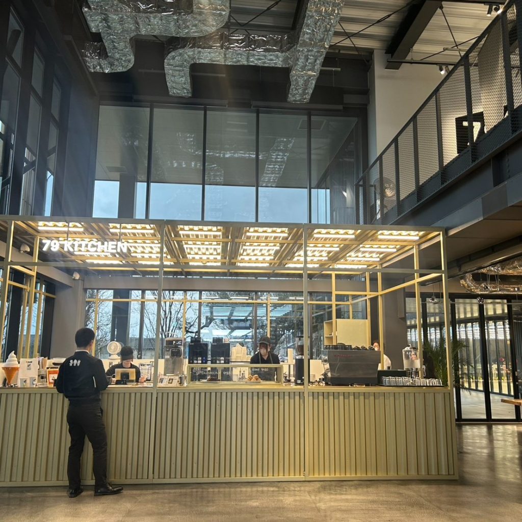 このパークは工場を一般公開し情報を発信する施設で、建物外観には意味深な「79」というロゴが描かれています。79とは「金(元素記号Au)」を表す原子番号で、石川県金沢の金箔から着想し、金が高価な価値を持つことになぞられているとのこと。世界で1番で細い合成繊維を作り、合繊素材の価値を高めていくという想いが込められています。