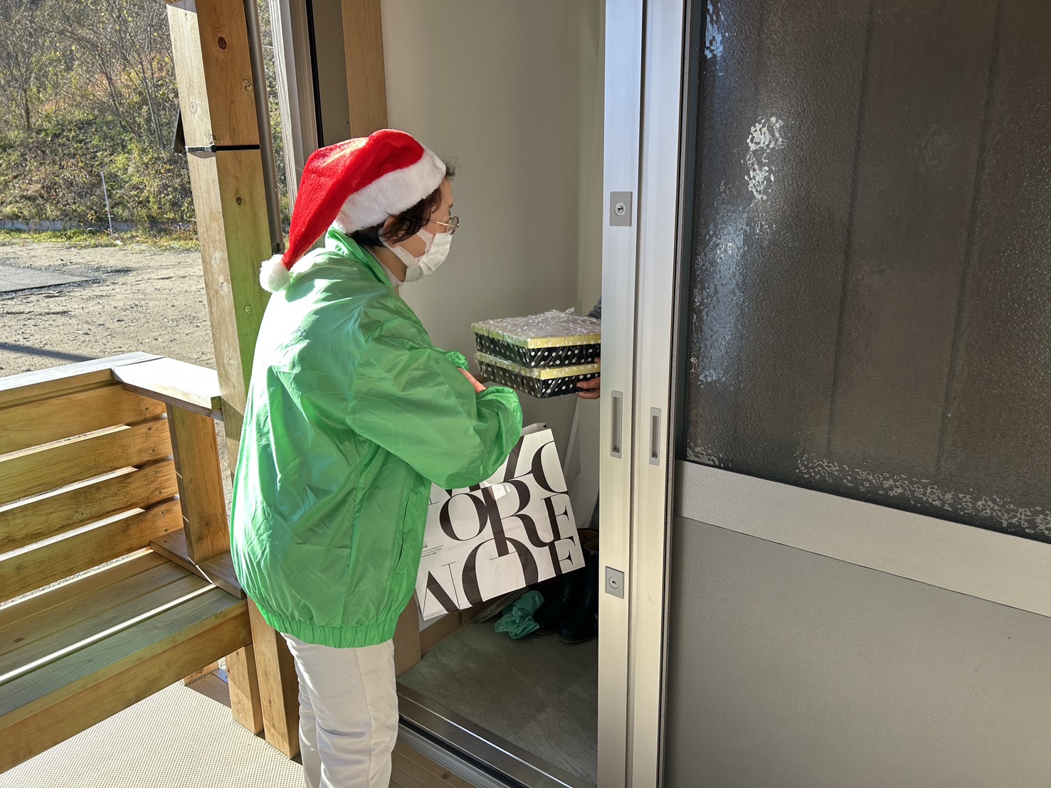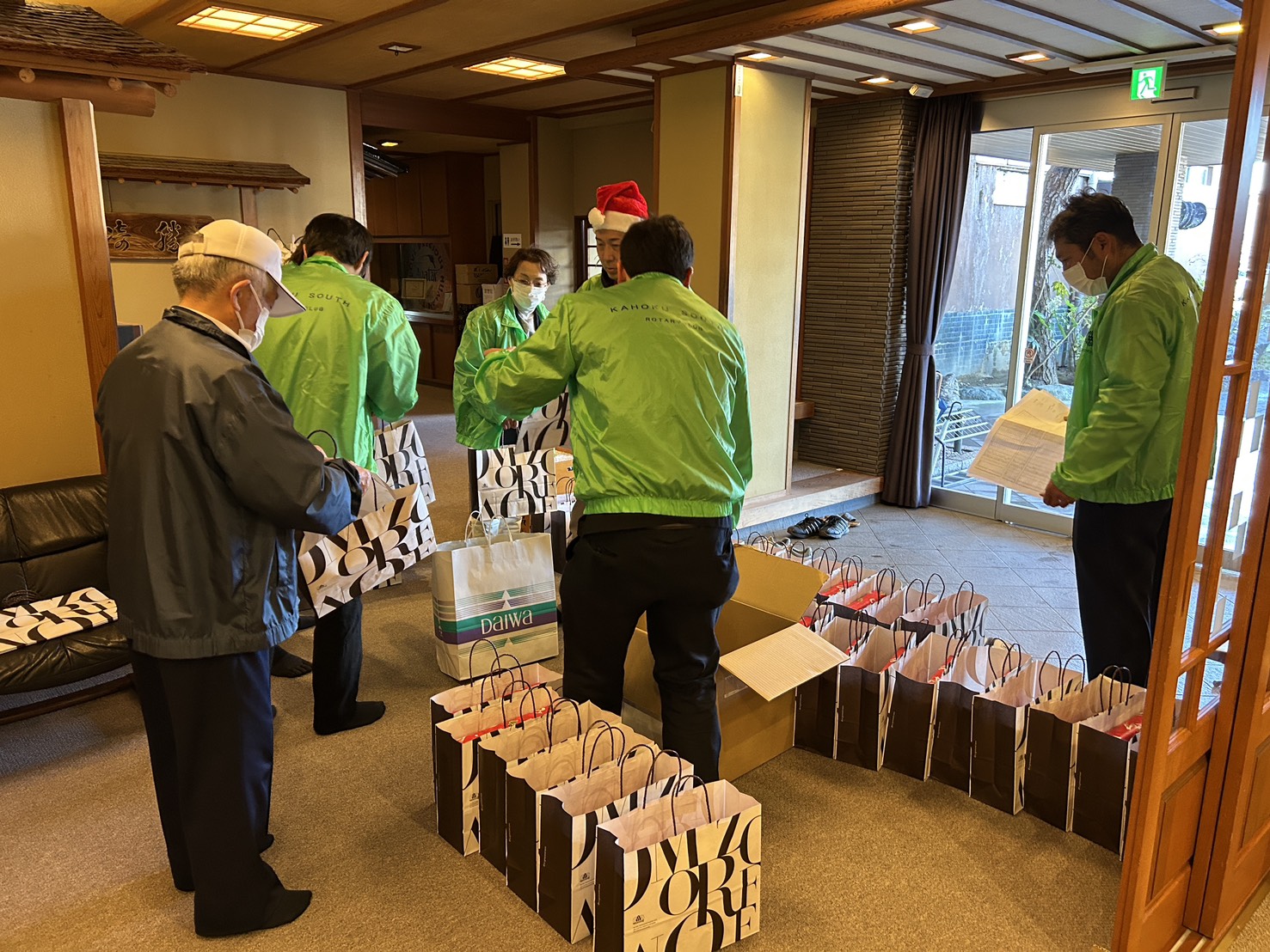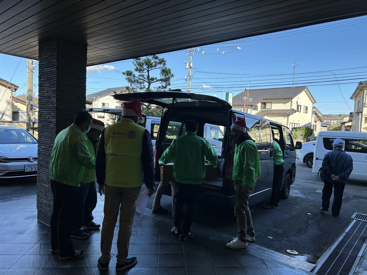 ニコニコ弁当プロジェクト 2025年12月20日 最終更新日時 : 2026年1月8日 kahokuminami-rc1 2025年12月20日土曜日はニコニコ弁当プロジェクト開催日です。 これは当クラブの能登半島地震被災地支援としての1イベントで、地域内の仮設住宅の希望住民にお弁当とお菓子を配ります。 当日は勝﨑館の特製弁当を117個準備して、仮設住宅の6団地へ、サンタの帽子をかぶった河北南ロータリーサンタが一人ひとりに手渡ししました。 年末の忙しい時期ではありましたが、10名を超えるクラブメンバーの参加により3編隊を組むことができ、各2団地ずつを割り当てて、お弁当とプレゼントのお菓子を車に積んで各ご家庭に向かいます。 「皆さんの笑顔が見られてよかった!」会長サンタの感想でした!